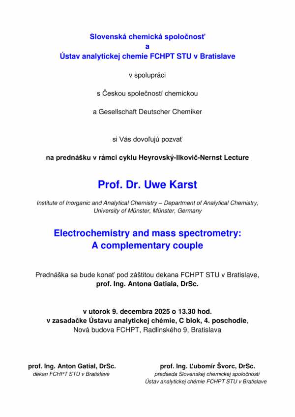 Zároveň by sme Vás radi srdečne pozvali na prednášku výnimočného hosťa, Prof. Dr. Uwe Karsta z Univerzity v Münsteri (Nemecko), ktorá sa uskutoční v rámci prestížneho cyklu Heyrovský – Ilkovič – Nernst Lecture 2025. Profesor Karst prednesie 9. decembra 2025 o 13:30 v zasadačke Ústavu analytickej chémie FCHPT STU prednášku na tému „Electrochemistry and mass spectrometry: A complementary couple“. Veríme, že sa opäť pripojíte v hojnom počte! Na záver pripomíname mladým vedeckým pracovníkom do 35 rokov možnosť nominovať sa na medzinárodné ocenenie EurJIC–Wöhler Young Investigator Prize v anorganickej chémii.