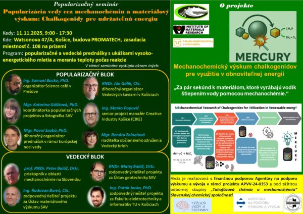 V uplynulom období sme mali možnosť zúčastniť sa viacerých zaujímavých podujatí, vrátane seminára „Veda pre udržateľnú energiu: Chalkogenidy a mechanochémia“ v Košiciach, ktorý priblížil prelomové objavy v tejto oblasti. V Bratislave sa konal odborný seminár s Ing. Petrom Kasardom, PhD., na tému „Personalizované implantáty“, ktorý sa zameral na inovatívne materiály a postupy v medicíne. Ak ste sa podujatí nemohli zúčastniť, sledujte, prosím, naše webové stránky, kde často zverejňujeme materiály a záznamy.
