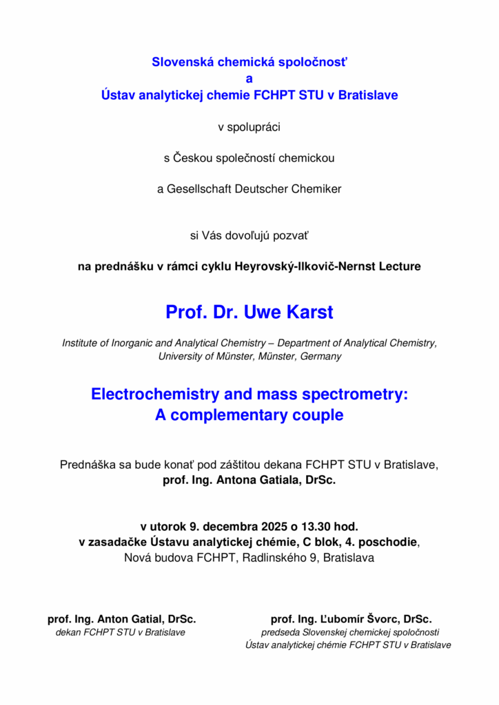 Slovenská chemická spoločnosť a Ústav analytickej chémie FCHPT STU v Bratislave si Vás dovoľujú srdečne pozvať na odborný seminár s prednáškou významného hosťa, Prof. Dr. Uwe Karsta z Institute of Inorganic and Analytical Chemistry – Department of Analytical Chemistry, University of Münster, Nemecko.